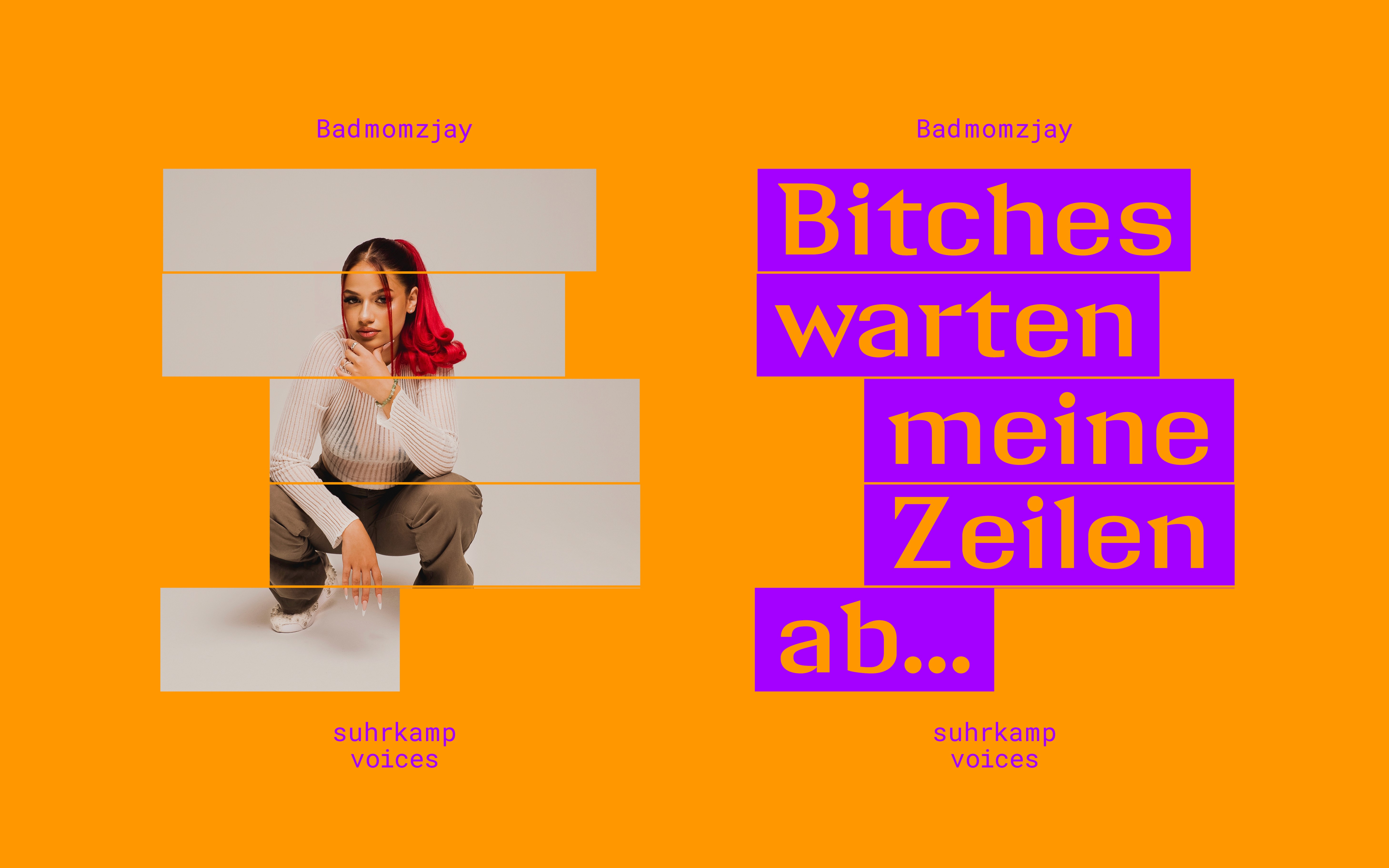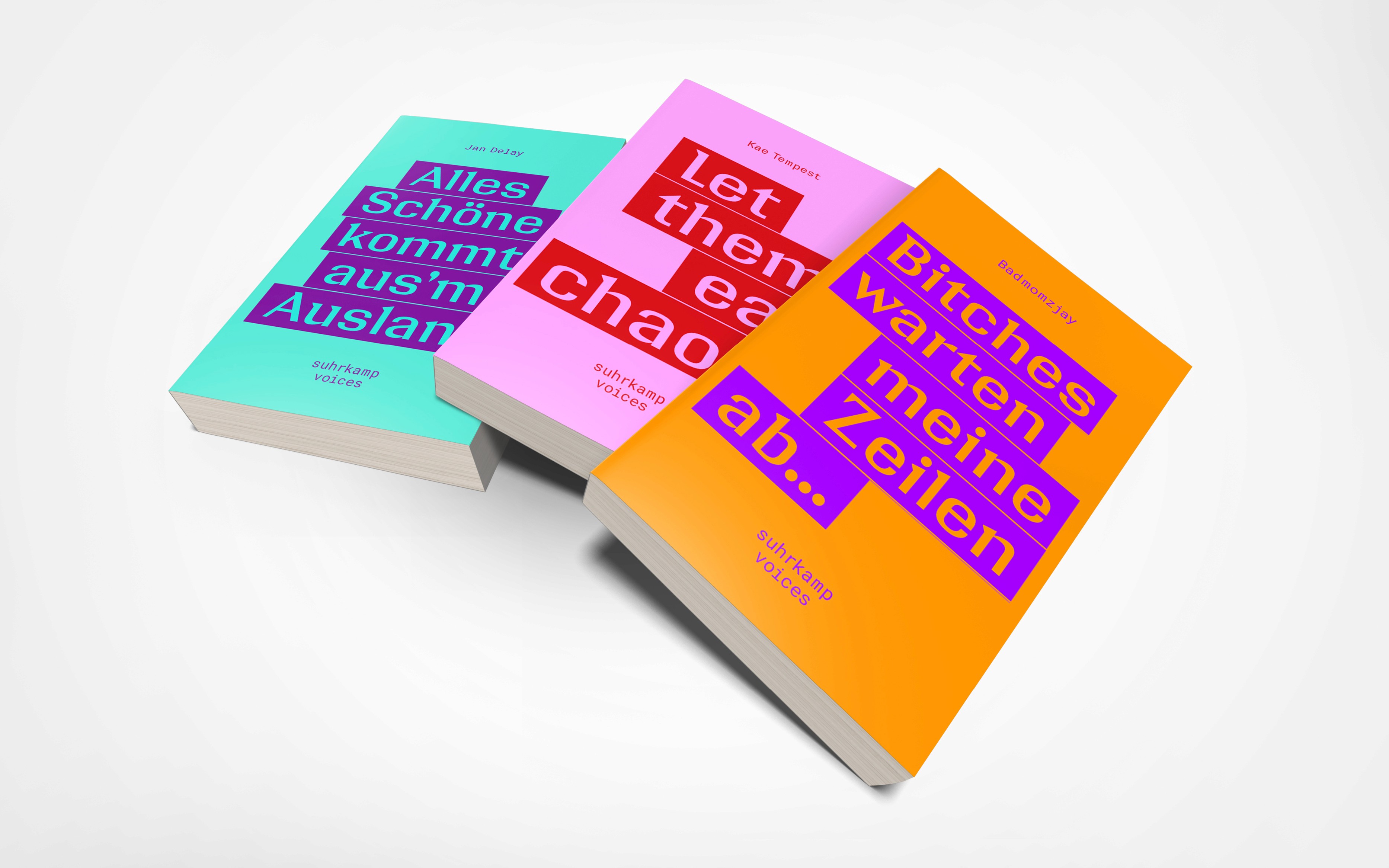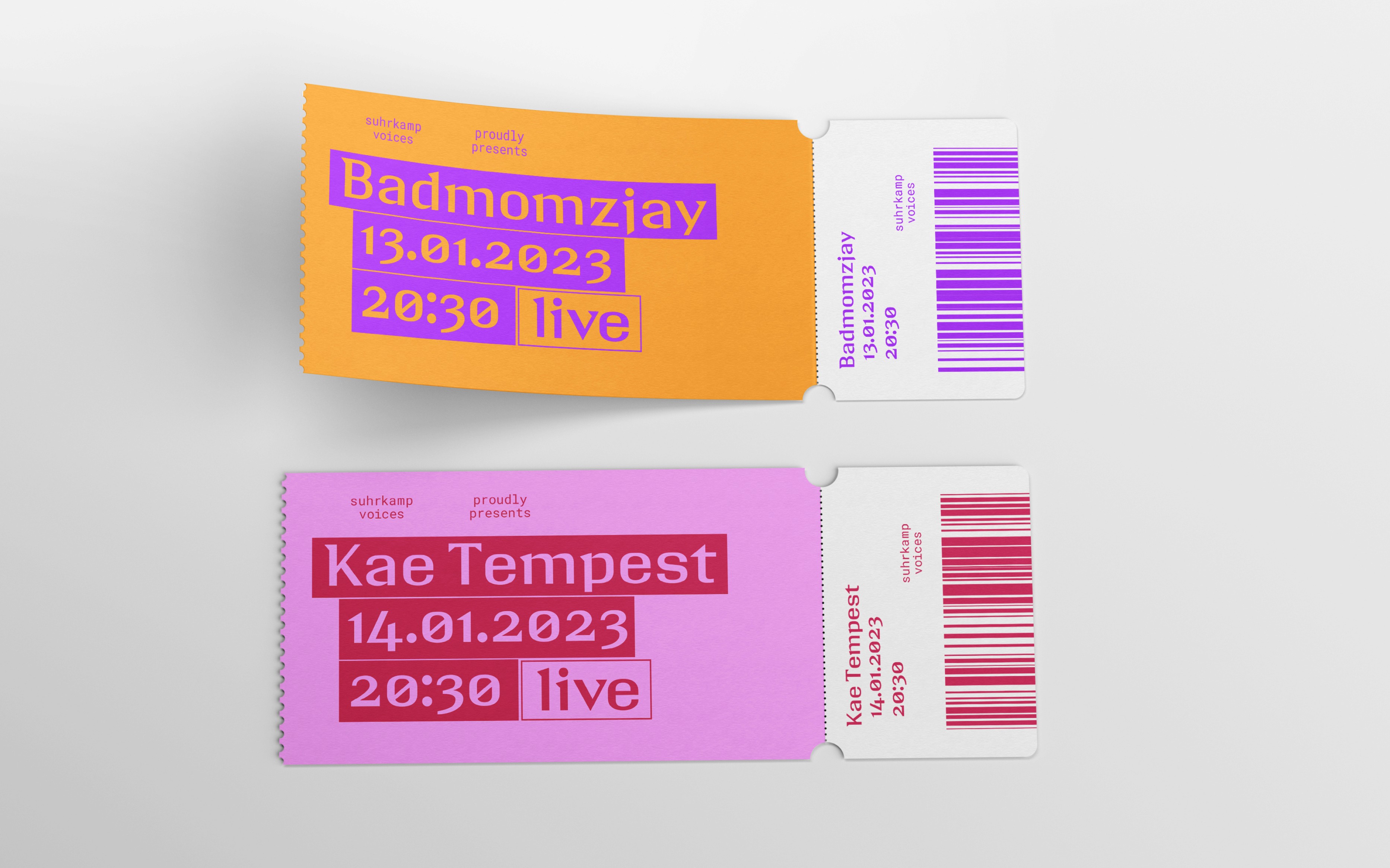 Suhrkamp Voices ist ein fiktives Format, das Songtexte als literarisches Material versteht. Im Zentrum steht eine eigens entwickelte Schrift. Sie bildet die Grundlage für das visuelle System und verbindet Inhalt und Gestaltung in einer klaren formalen Struktur.