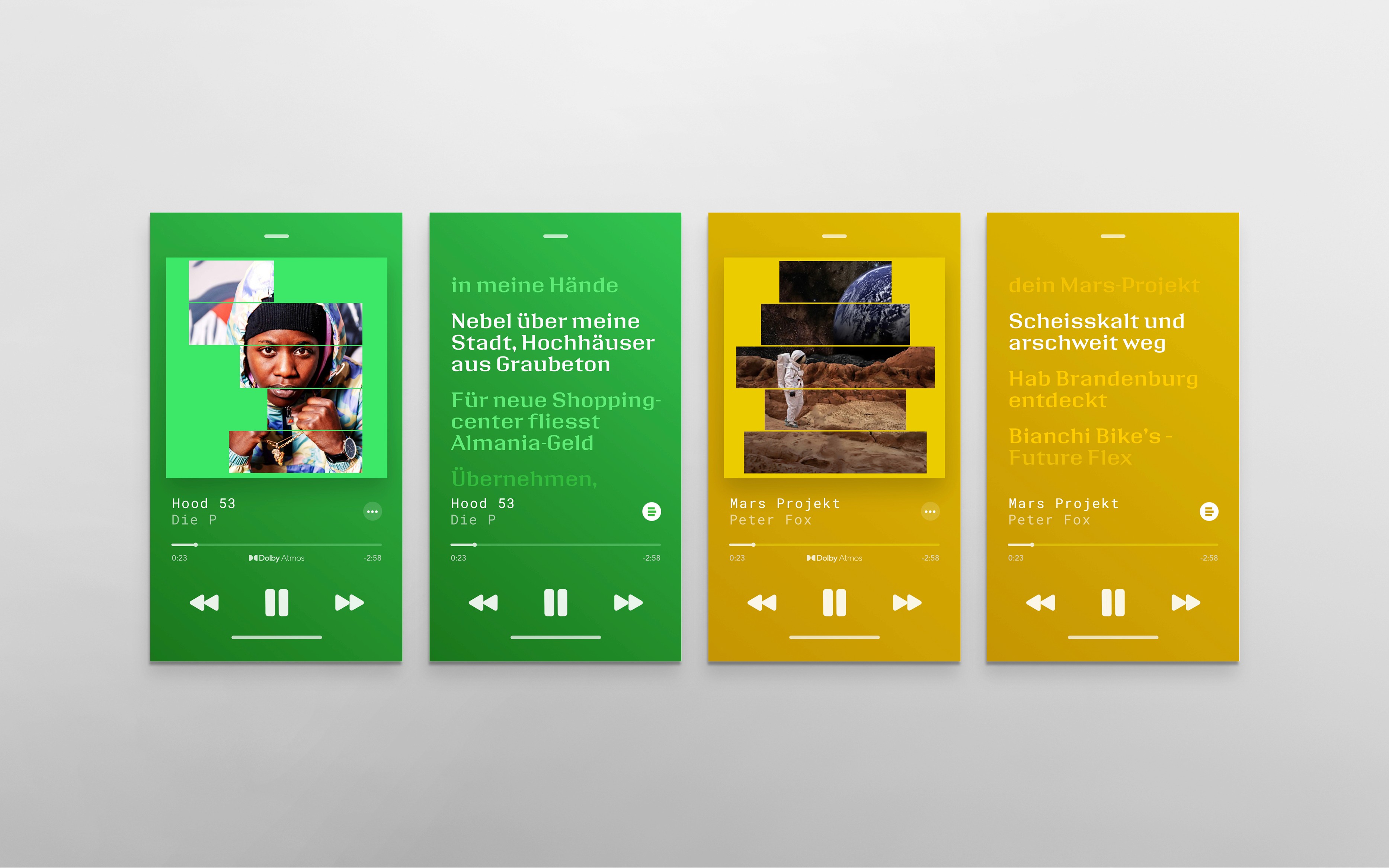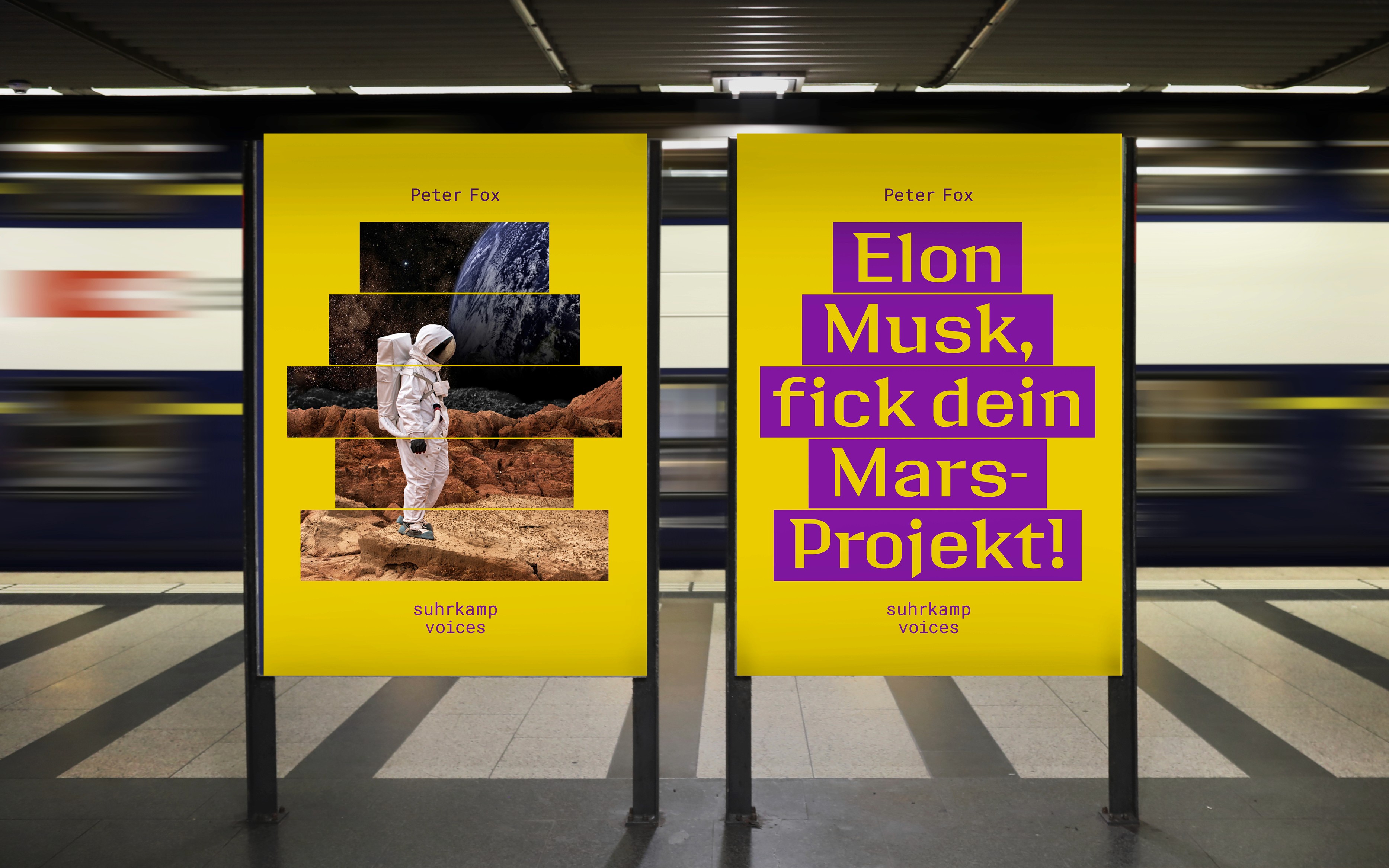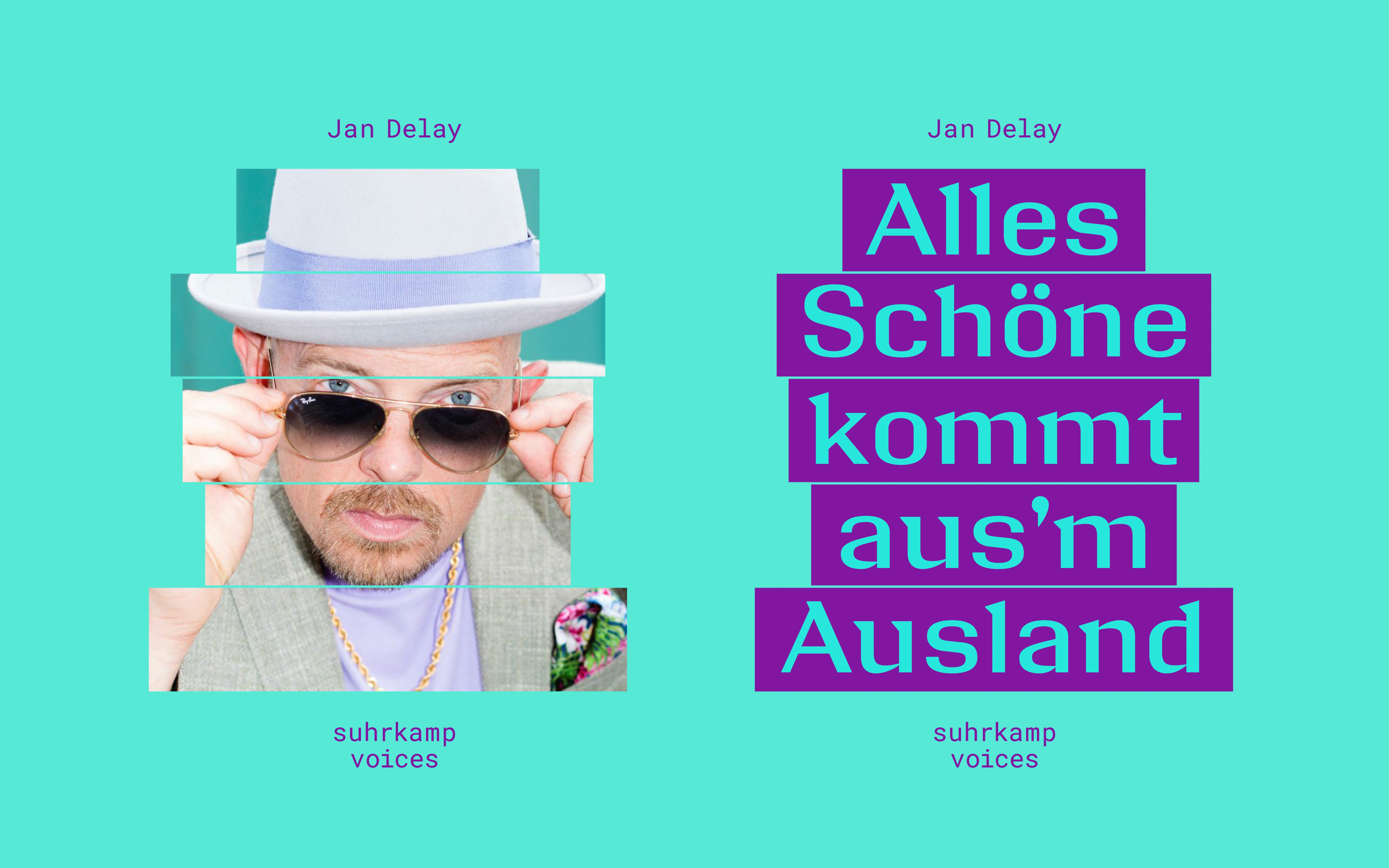Suhrkamp Voices ist ein fiktives Format, das Songtexte als literarisches Material versteht. Im Zentrum steht eine eigens entwickelte Schrift. Sie bildet die Grundlage für das visuelle System und verbindet Inhalt und Gestaltung in einer klaren formalen Struktur.